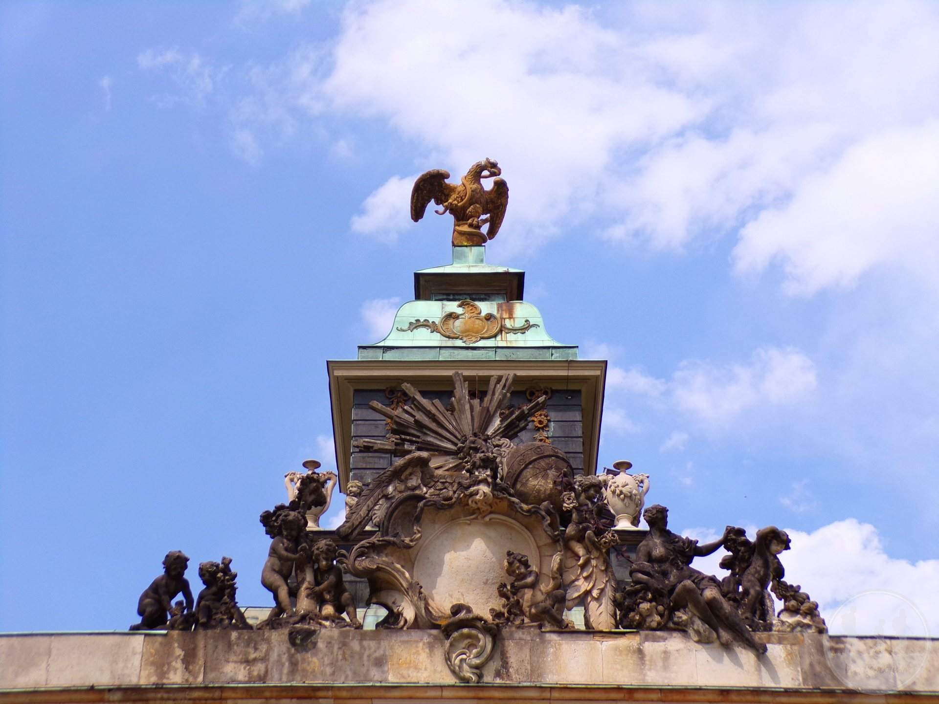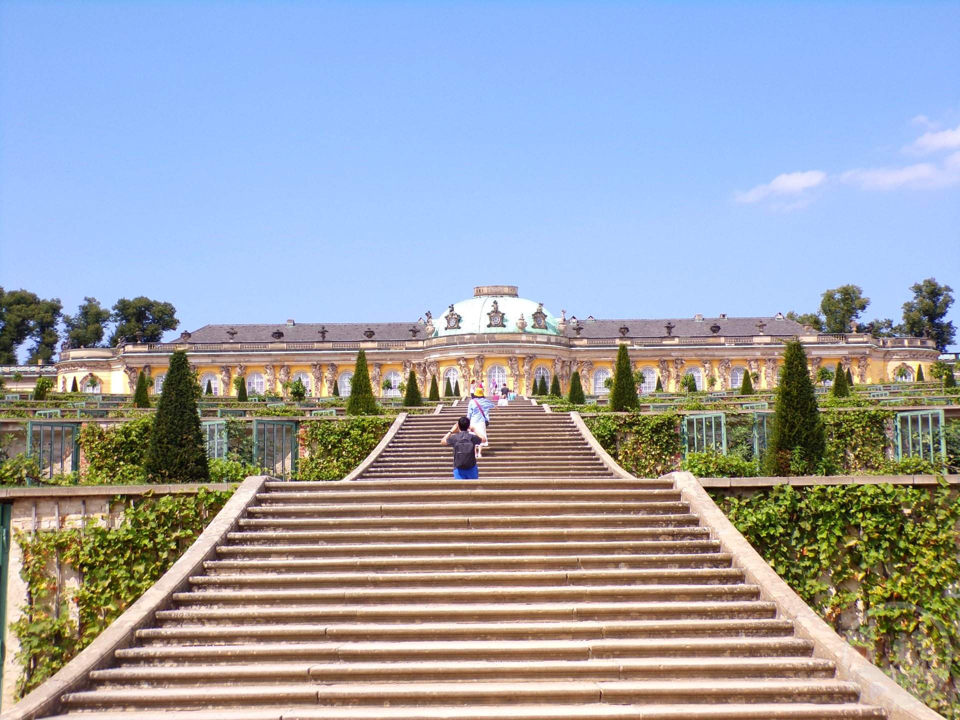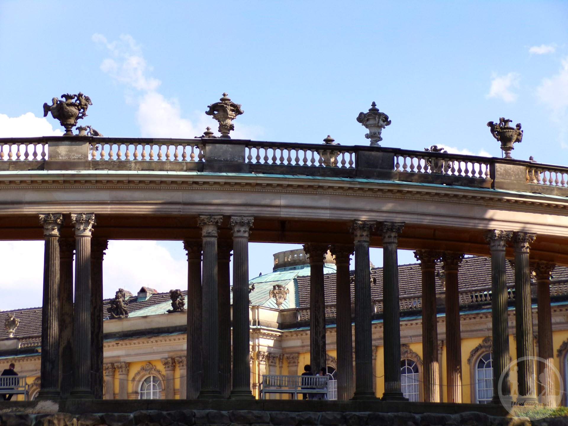 Następnie główny cel, czyli Pałac Sanssouci, co tu dużo mówić, jest piękny, a sześć tarasów obsadzonych winoroślą jest idealnie wkomponowanych. Właściwie wszystko zaczęło się właśnie od tych tarasów. Fryderyk Wielki chciał mieć piękny ogród i hodować w nim m.in. figi i winorośl. W tym celu właśnie stworzono ogrody tarasowe. Fryderykowi tak się to miejsce spodobało, że postanowił wybudować tu letnią rezydencję a ogrody z racji, że „wyszły z mody” zostały przearanżowane na styl krajobrazowy. Kolejna budowla to Bildergalerie, czyli Galeria Malarstwa, barokowy pałac wybudowany w latach 1755 – 64, tworzący przeciwwagę dla pałacu Neue Kammern. Jest to najstarsze, nieprzerwanie otwarte muzeum na terenie Niemiec. Pomiędzy oknami znajduje się 18 marmurowych rzeźb, symbolizujących dyscypliny naukowe i sztuki piękne.