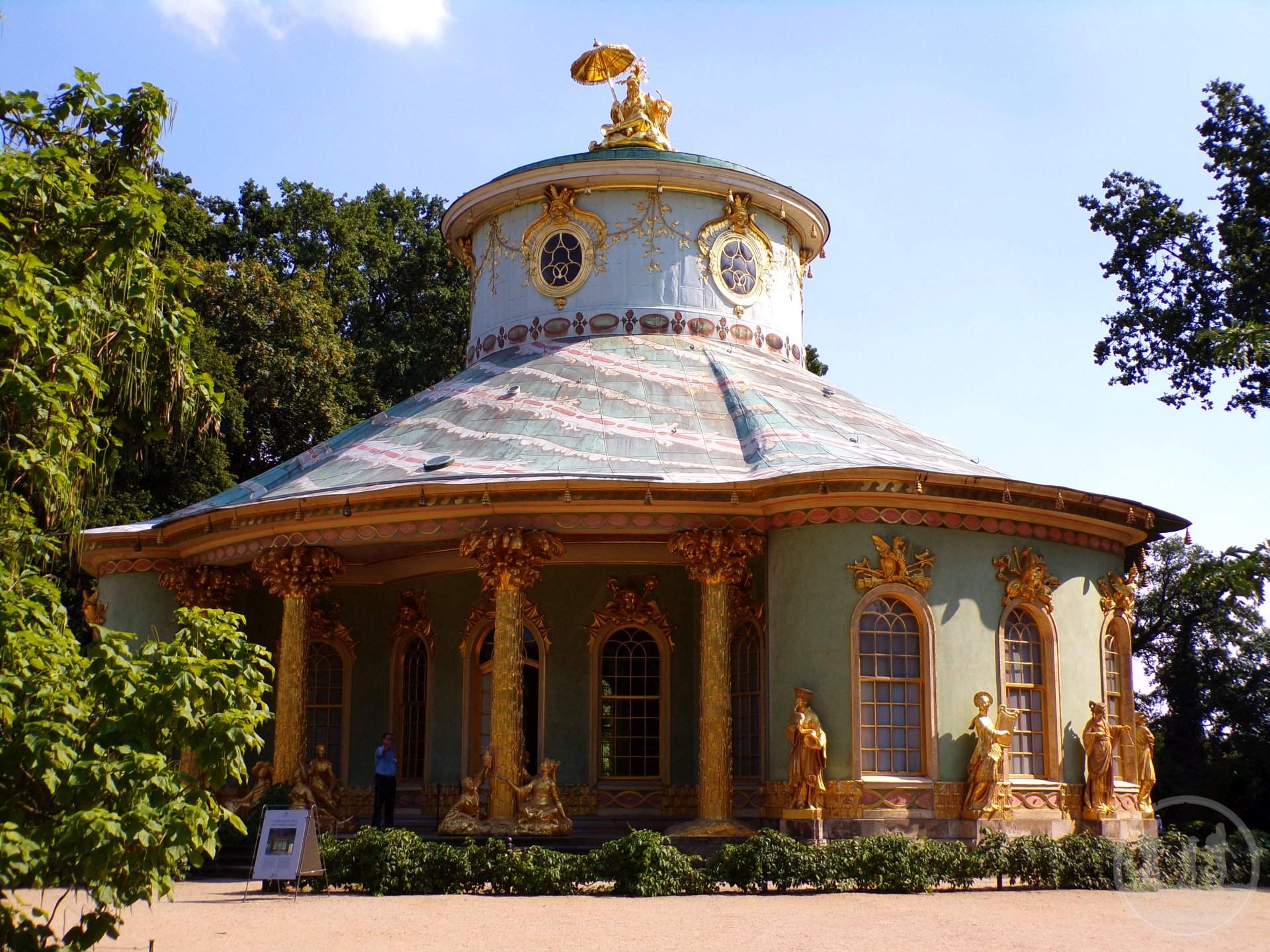 Interesującym budynkiem jest Pawilon Chiński - herbaciarnia (Chinesisches Tee Haus). Jest to rokokowy pawilon ogrodowy łączący w sobie pruskie rokoko z formami wschodnioazjatyckimi. Powstał w latach 1755 – 64 na podstawie szkiców króla Fryderyka II Wielkiego.