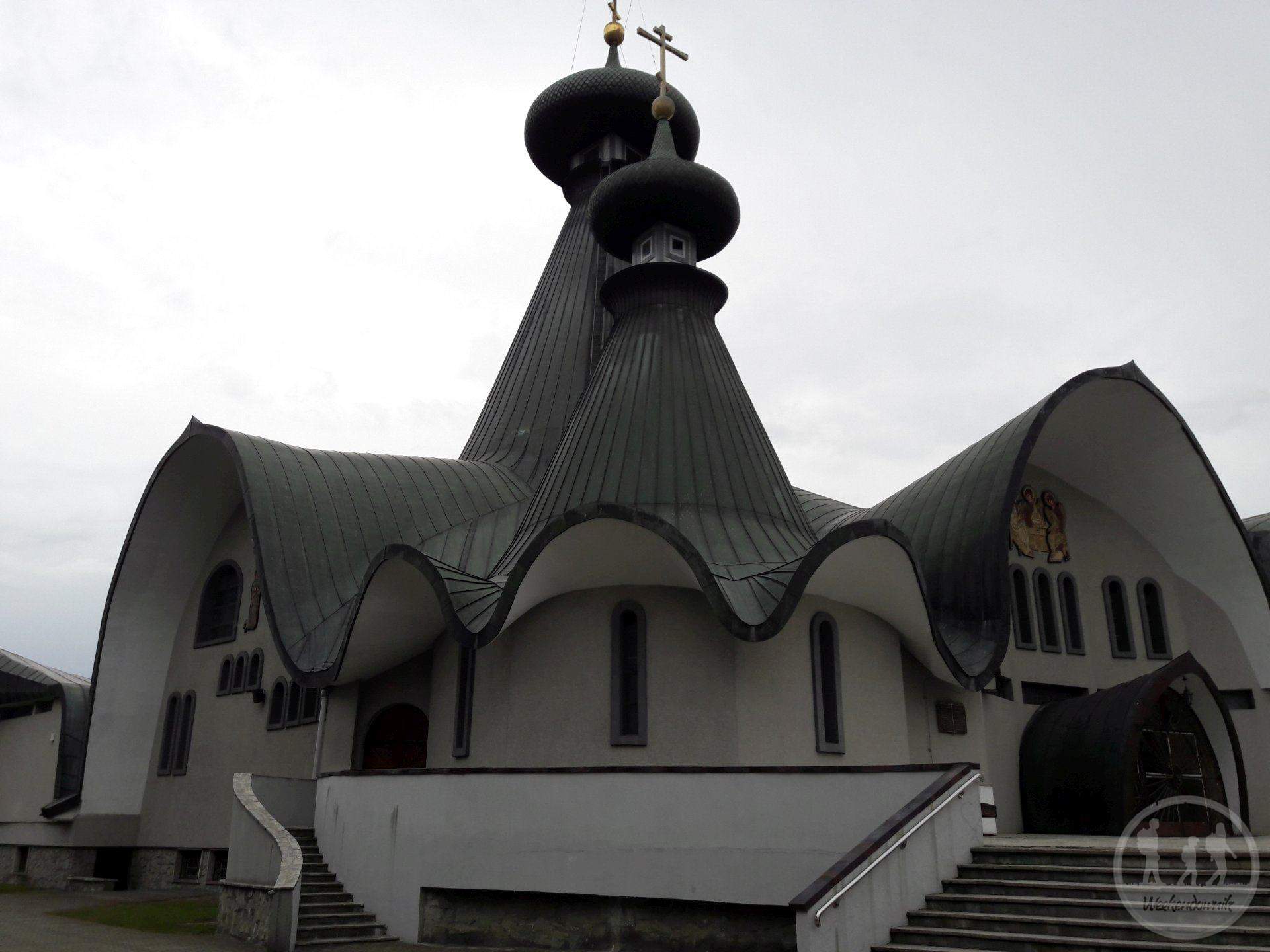 Kiedy wejdziecie do środka i nasycicie już wzrok widokiem ikonostasu, pięknych malowideł, polichromii i ikon zerknijcie w górę na panikadiło, czyli przepiękny żyrandol w kształcie równoramiennego krzyża greckiego ozdobiony witrażami Bogarodzicy i słowiańskich świętych.